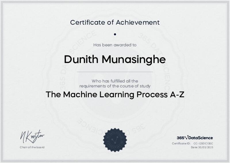 This user has been awarded the The Machine Learning Process A-Z Certificate for successfully completing the course exam. Holding this certificate demonstrates their proficiency on the topic and signifies they are qualified to apply their newly acquired expertise in the fields of data analytics and data science.
