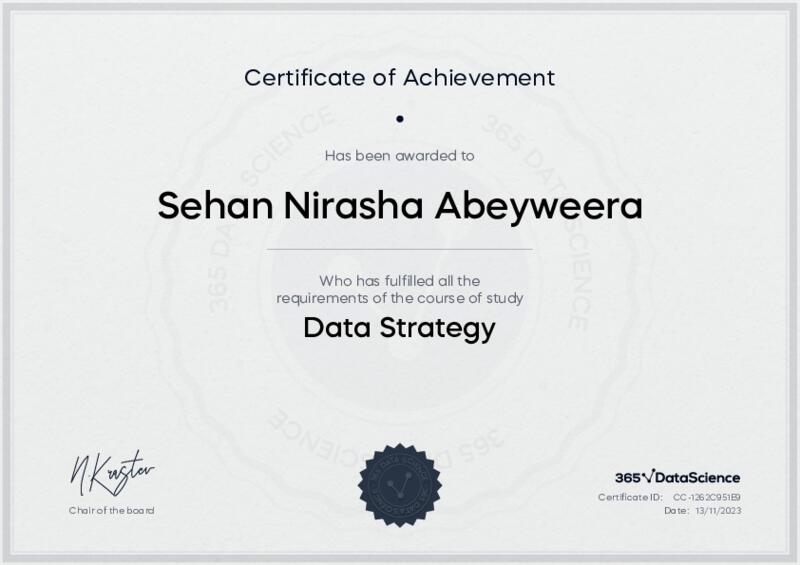 This user has been awarded the Data Strategy Certificate for successfully completing the course exam. Holding this certificate demonstrates their proficiency on the topic and signifies they are qualified to apply their newly acquired expertise in the fields of data analytics and data science.