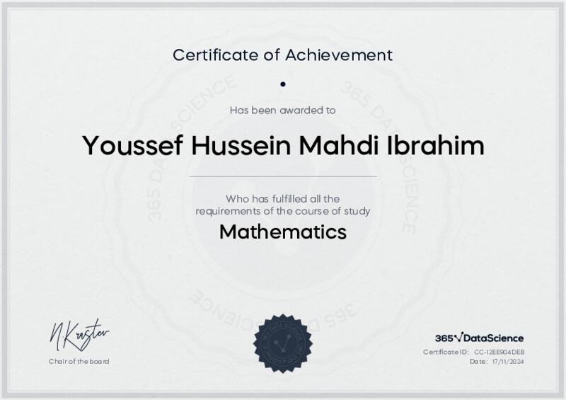 This user has been awarded the Mathematics Certificate for successfully completing the course exam. Holding this certificate demonstrates their proficiency on the topic and signifies they are qualified to apply their newly acquired expertise in the fields of data analytics and data science.