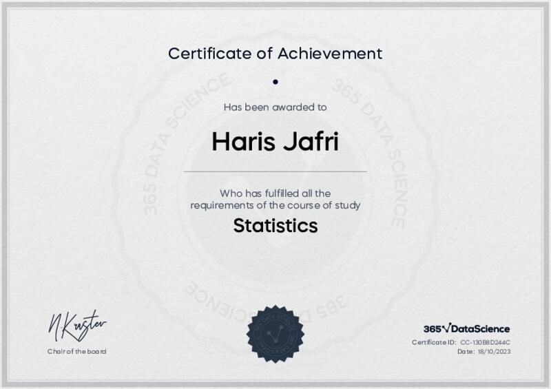 This user has been awarded the Statistics Certificate for successfully completing the course exam. Holding this certificate demonstrates their proficiency on the topic and signifies they are qualified to apply their newly acquired expertise in the fields of data analytics and data science.