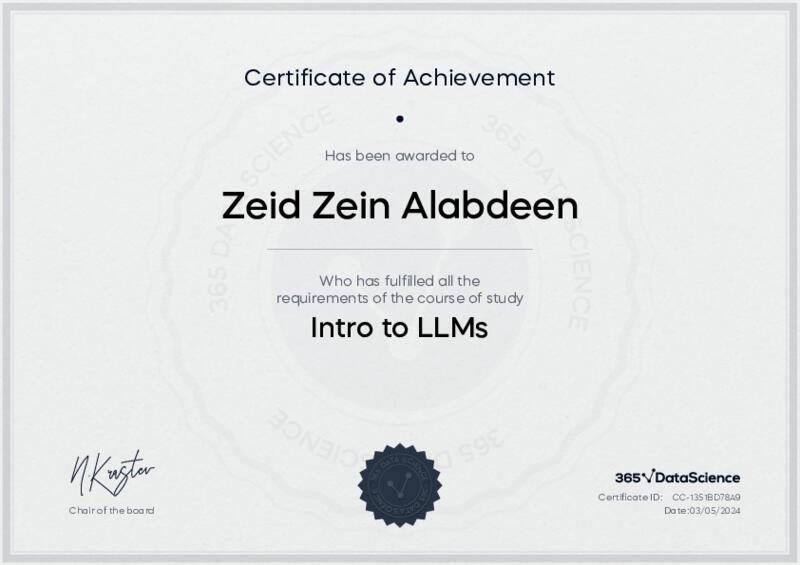 This user has been awarded the Intro to LLMs Certificate for successfully completing the course exam. Holding this certificate demonstrates their proficiency on the topic and signifies they are qualified to apply their newly acquired expertise in the fields of data analytics and data science.