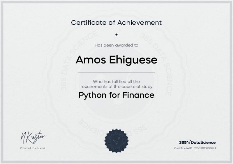 This user has been awarded the Python for Finance Certificate for successfully completing the course exam. Holding this certificate demonstrates their proficiency on the topic and signifies they are qualified to apply their newly acquired expertise in the fields of data analytics and data science.