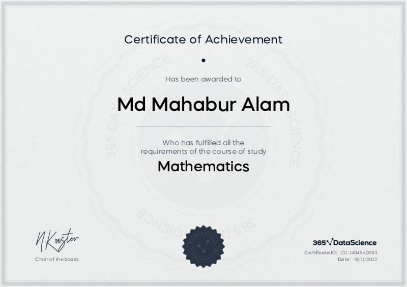 This user has been awarded the Mathematics Certificate for successfully completing the course exam. Holding this certificate demonstrates their proficiency on the topic and signifies they are qualified to apply their newly acquired expertise in the fields of data analytics and data science.