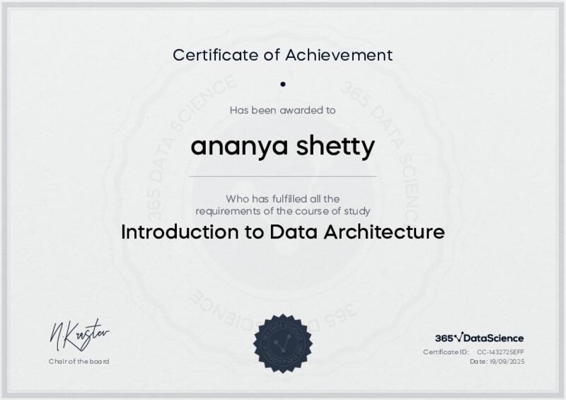 This user has been awarded the Introduction to Data Architecture Certificate for successfully completing the course exam. Holding this certificate demonstrates their proficiency on the topic and signifies they are qualified to apply their newly acquired expertise in the fields of data analytics and data science.