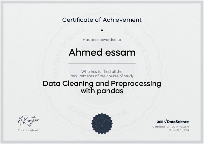 This user has been awarded the Data Cleaning and Preprocessing with pandas Certificate for successfully completing the course exam. Holding this certificate demonstrates their proficiency on the topic and signifies they are qualified to apply their newly acquired expertise in the fields of data analytics and data science.
