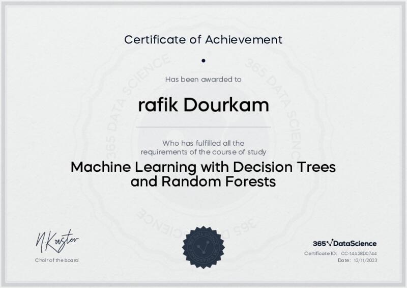 This user has been awarded the Machine Learning with Decision Trees and Random Forests Certificate for successfully completing the course exam. Holding this certificate demonstrates their proficiency on the topic and signifies they are qualified to apply their newly acquired expertise in the fields of data analytics and data science.