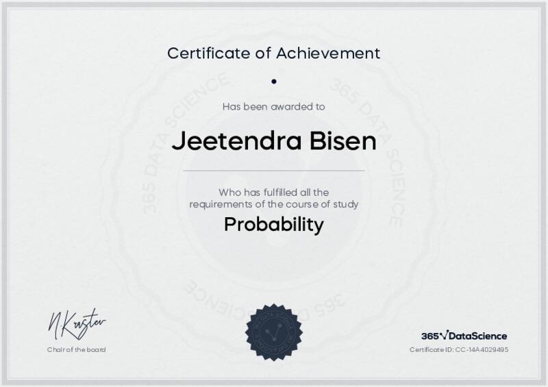 This user has been awarded the Probability Certificate for successfully completing the course exam. Holding this certificate demonstrates their proficiency on the topic and signifies they are qualified to apply their newly acquired expertise in the fields of data analytics and data science.