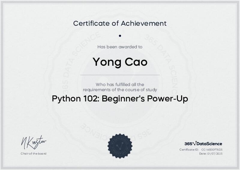 This user has been awarded the Python 102: Beginner's Power-Up Certificate for successfully completing the course exam. Holding this certificate demonstrates their proficiency on the topic and signifies they are qualified to apply their newly acquired expertise in the fields of data analytics and data science.