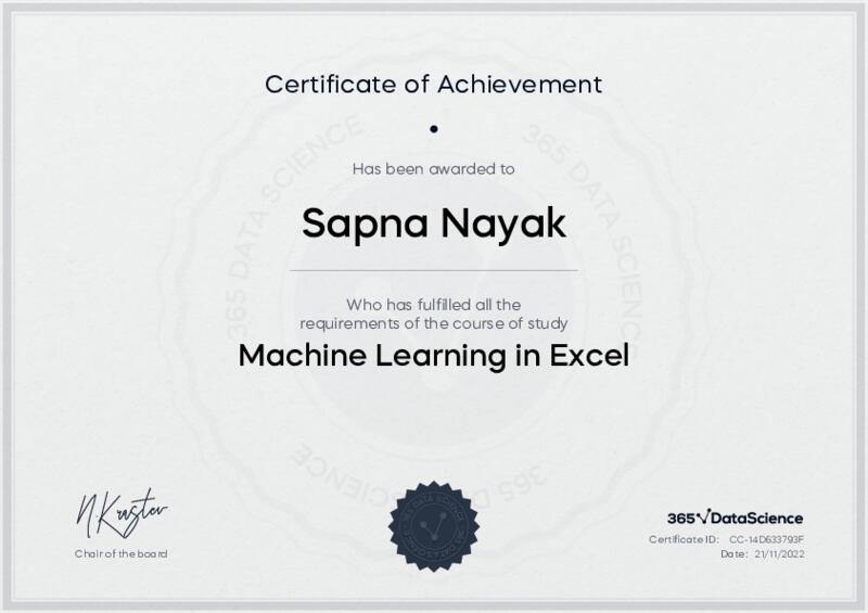 This user has been awarded the Machine Learning in Excel Certificate for successfully completing the course exam. Holding this certificate demonstrates their proficiency on the topic and signifies they are qualified to apply their newly acquired expertise in the fields of data analytics and data science.