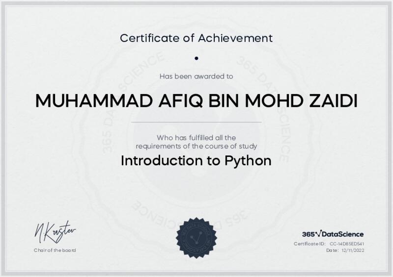 This user has been awarded the Introduction to Python Certificate for successfully completing the course exam. Holding this certificate demonstrates their proficiency on the topic and signifies they are qualified to apply their newly acquired expertise in the fields of data analytics and data science.