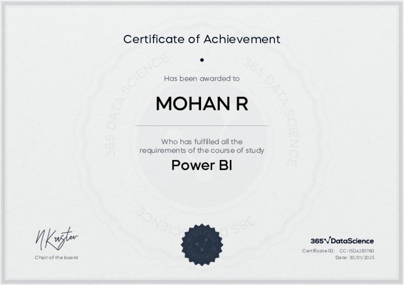 This user has been awarded the Power BI Certificate for successfully completing the course exam. Holding this certificate demonstrates their proficiency on the topic and signifies they are qualified to apply their newly acquired expertise in the fields of data analytics and data science.