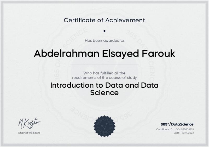 This user has been awarded the Introduction to Data and Data Science Certificate for successfully completing the course exam. Holding this certificate demonstrates their proficiency on the topic and signifies they are qualified to apply their newly acquired expertise in the fields of data analytics and data science.