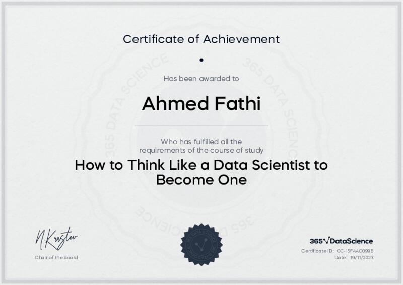 This user has been awarded the How to Think Like a Data Scientist to Become One Certificate for successfully completing the course exam. Holding this certificate demonstrates their proficiency on the topic and signifies they are qualified to apply their newly acquired expertise in the fields of data analytics and data science.