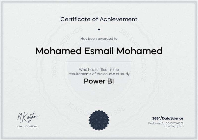 This user has been awarded the Power BI Certificate for successfully completing the course exam. Holding this certificate demonstrates their proficiency on the topic and signifies they are qualified to apply their newly acquired expertise in the fields of data analytics and data science.