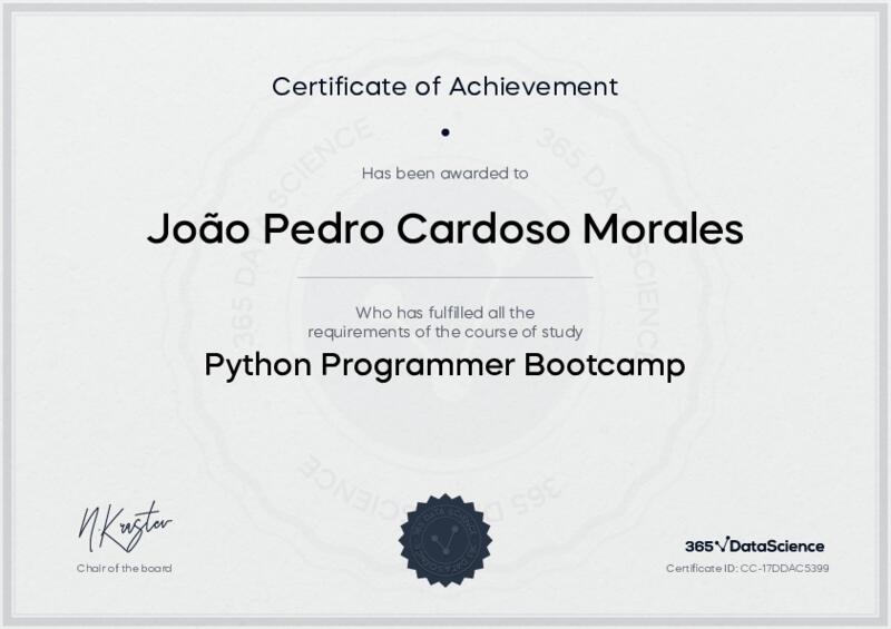 This user has been awarded the Python Programmer Bootcamp Certificate for successfully completing the course exam. Holding this certificate demonstrates their proficiency on the topic and signifies they are qualified to apply their newly acquired expertise in the fields of data analytics and data science.