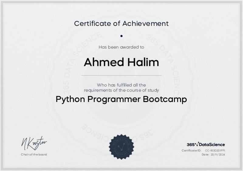 This user has been awarded the Python Programmer Bootcamp Certificate for successfully completing the course exam. Holding this certificate demonstrates their proficiency on the topic and signifies they are qualified to apply their newly acquired expertise in the fields of data analytics and data science.