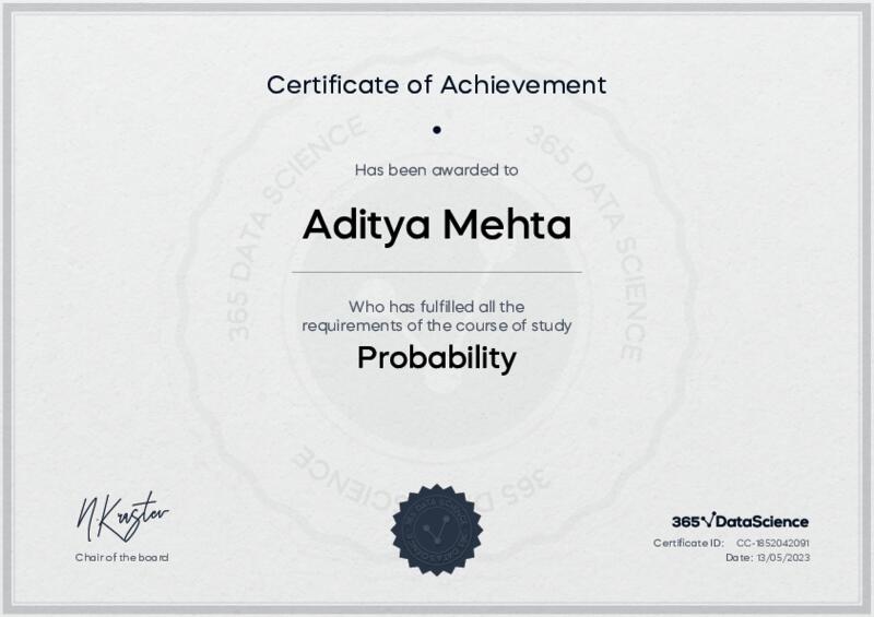 This user has been awarded the Probability Certificate for successfully completing the course exam. Holding this certificate demonstrates their proficiency on the topic and signifies they are qualified to apply their newly acquired expertise in the fields of data analytics and data science.