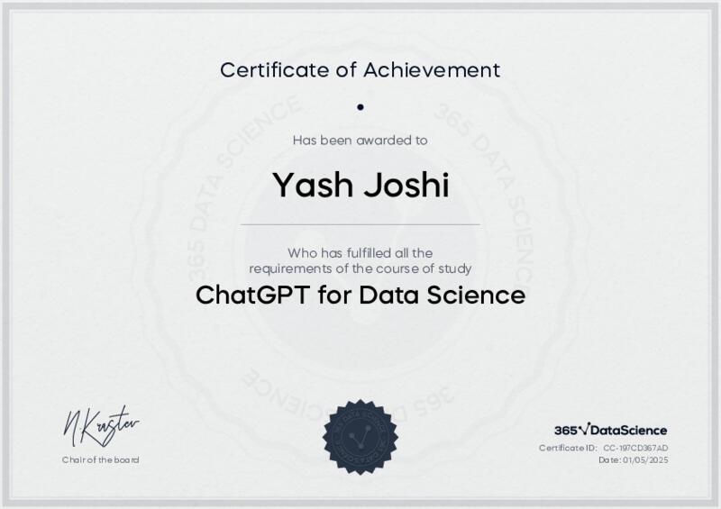 This user has been awarded the ChatGPT for Data Science Certificate for successfully completing the course exam. Holding this certificate demonstrates their proficiency on the topic and signifies they are qualified to apply their newly acquired expertise in the fields of data analytics and data science.
