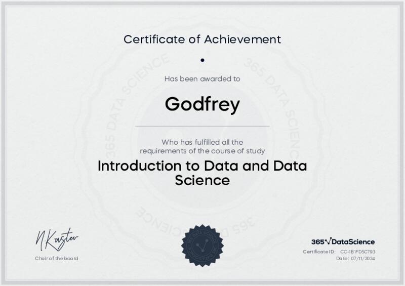 This user has been awarded the Introduction to Data and Data Science Certificate for successfully completing the course exam. Holding this certificate demonstrates their proficiency on the topic and signifies they are qualified to apply their newly acquired expertise in the fields of data analytics and data science.