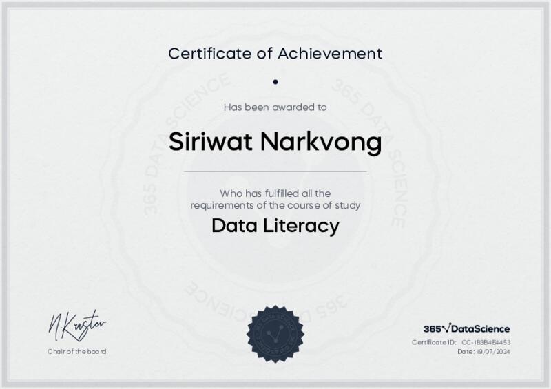 This user has been awarded the Data Literacy Certificate for successfully completing the course exam. Holding this certificate demonstrates their proficiency on the topic and signifies they are qualified to apply their newly acquired expertise in the fields of data analytics and data science.