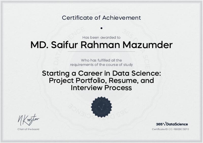 This user has been awarded the Starting a Career in Data Science: Project Portfolio, Resume, and Interview Process Certificate for successfully completing the course exam. Holding this certificate demonstrates their proficiency on the topic and signifies they are qualified to apply their newly acquired expertise in the fields of data analytics and data science.