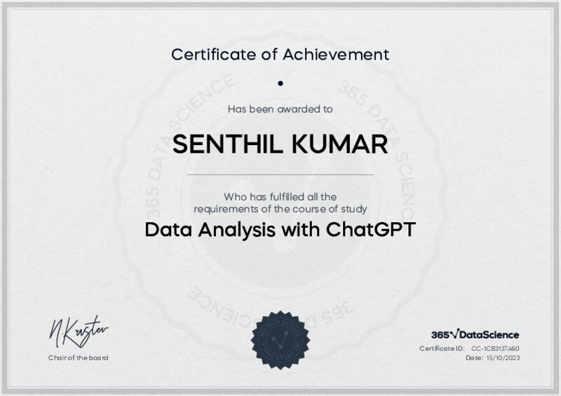 This user has been awarded the Data Analysis with ChatGPT Certificate for successfully completing the course exam. Holding this certificate demonstrates their proficiency on the topic and signifies they are qualified to apply their newly acquired expertise in the fields of data analytics and data science.