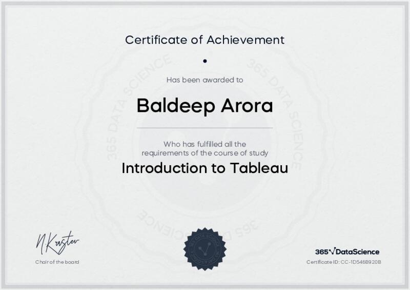 This user has been awarded the Introduction to Tableau Certificate for successfully completing the course exam. Holding this certificate demonstrates their proficiency on the topic and signifies they are qualified to apply their newly acquired expertise in the fields of data analytics and data science.