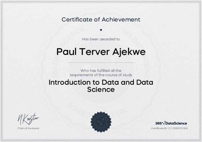This user has been awarded the Introduction to Data and Data Science Certificate for successfully completing the course exam. Holding this certificate demonstrates their proficiency on the topic and signifies they are qualified to apply their newly acquired expertise in the fields of data analytics and data science.