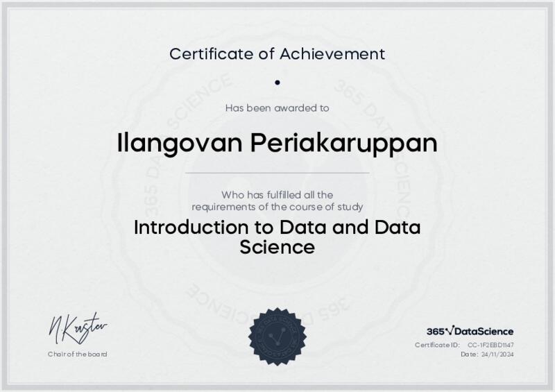 This user has been awarded the Introduction to Data and Data Science Certificate for successfully completing the course exam. Holding this certificate demonstrates their proficiency on the topic and signifies they are qualified to apply their newly acquired expertise in the fields of data analytics and data science.