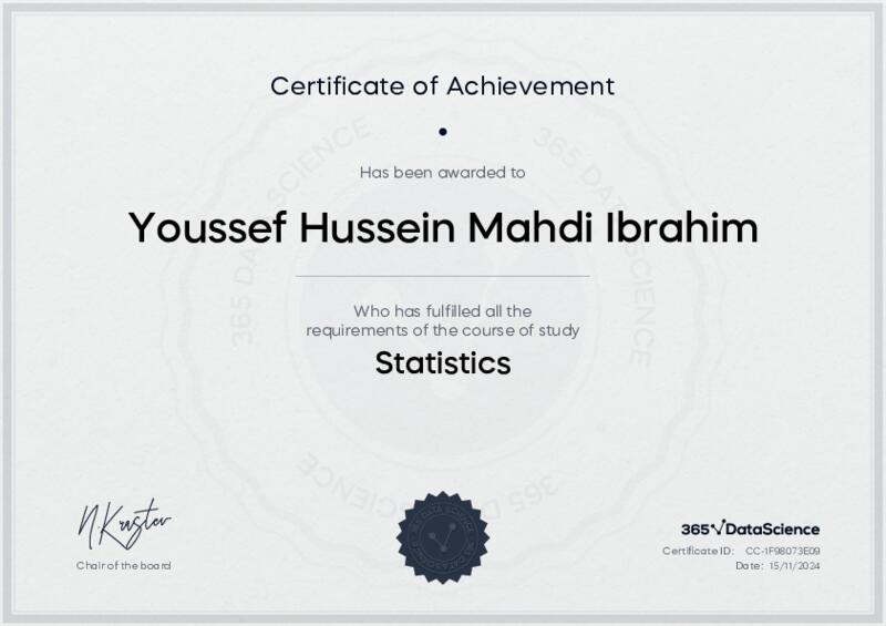 This user has been awarded the Statistics Certificate for successfully completing the course exam. Holding this certificate demonstrates their proficiency on the topic and signifies they are qualified to apply their newly acquired expertise in the fields of data analytics and data science.