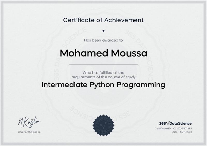 This user has been awarded the Intermediate Python Programming Certificate for successfully completing the course exam. Holding this certificate demonstrates their proficiency on the topic and signifies they are qualified to apply their newly acquired expertise in the fields of data analytics and data science.