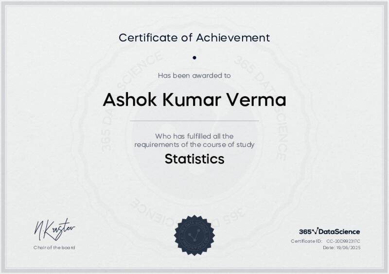 This user has been awarded the Statistics Certificate for successfully completing the course exam. Holding this certificate demonstrates their proficiency on the topic and signifies they are qualified to apply their newly acquired expertise in the fields of data analytics and data science.