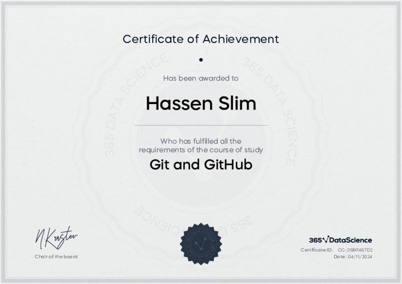 This user has been awarded the Git and GitHub Certificate for successfully completing the course exam. Holding this certificate demonstrates their proficiency on the topic and signifies they are qualified to apply their newly acquired expertise in the fields of data analytics and data science.
