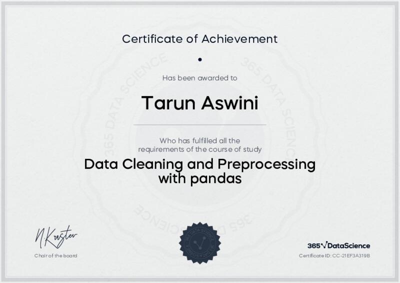This user has been awarded the Data Cleaning and Preprocessing with pandas Certificate for successfully completing the course exam. Holding this certificate demonstrates their proficiency on the topic and signifies they are qualified to apply their newly acquired expertise in the fields of data analytics and data science.