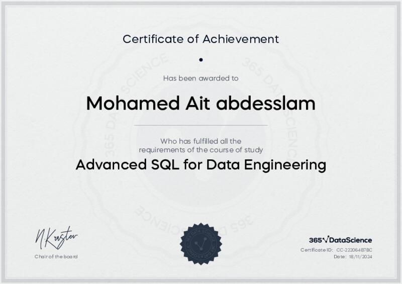 This user has been awarded the Advanced SQL for Data Engineering Certificate for successfully completing the course exam. Holding this certificate demonstrates their proficiency on the topic and signifies they are qualified to apply their newly acquired expertise in the fields of data analytics and data science.