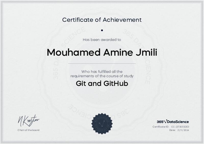 This user has been awarded the Git and GitHub Certificate for successfully completing the course exam. Holding this certificate demonstrates their proficiency on the topic and signifies they are qualified to apply their newly acquired expertise in the fields of data analytics and data science.