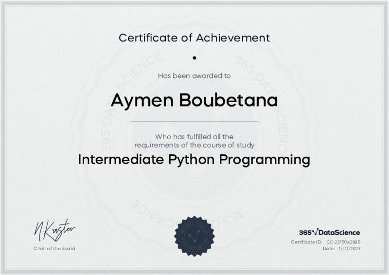 This user has been awarded the Intermediate Python Programming Certificate for successfully completing the course exam. Holding this certificate demonstrates their proficiency on the topic and signifies they are qualified to apply their newly acquired expertise in the fields of data analytics and data science.
