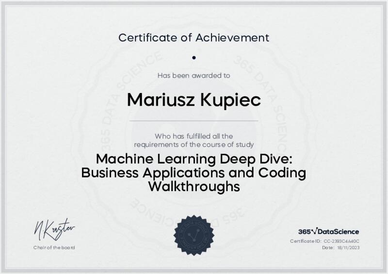This user has been awarded the Machine Learning Deep Dive: Business Applications and Coding Walkthroughs Certificate for successfully completing the course exam. Holding this certificate demonstrates their proficiency on the topic and signifies they are qualified to apply their newly acquired expertise in the fields of data analytics and data science.