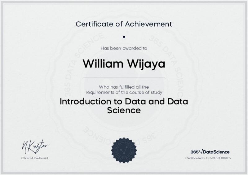 This user has been awarded the Introduction to Data and Data Science Certificate for successfully completing the course exam. Holding this certificate demonstrates their proficiency on the topic and signifies they are qualified to apply their newly acquired expertise in the fields of data analytics and data science.
