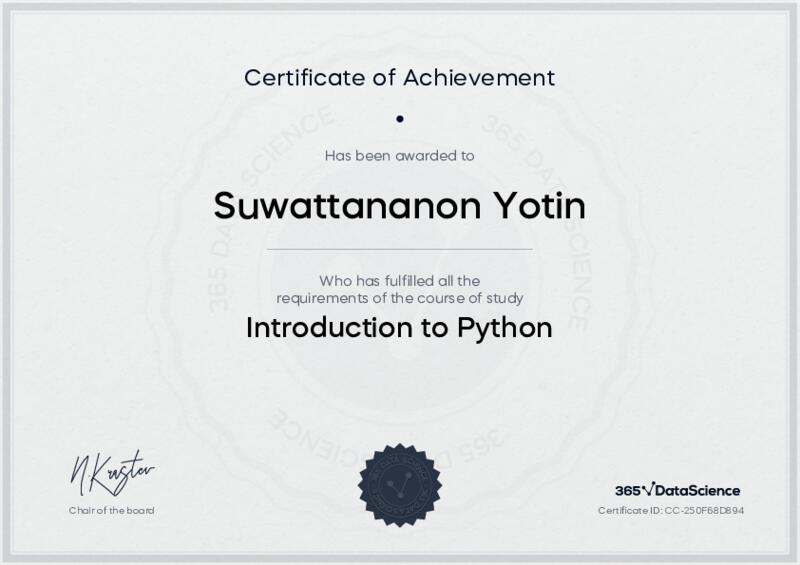 This user has been awarded the Introduction to Python Certificate for successfully completing the course exam. Holding this certificate demonstrates their proficiency on the topic and signifies they are qualified to apply their newly acquired expertise in the fields of data analytics and data science.
