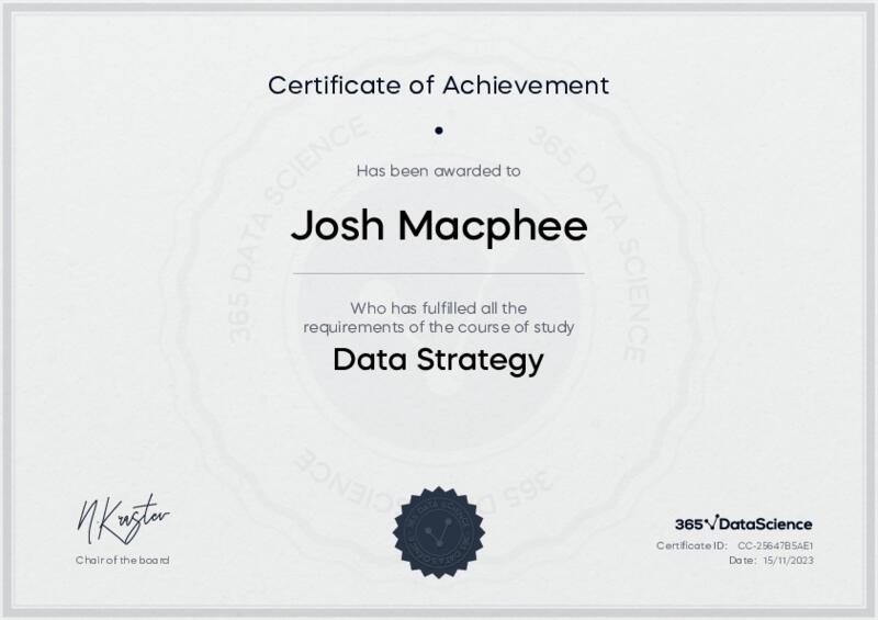 This user has been awarded the Data Strategy Certificate for successfully completing the course exam. Holding this certificate demonstrates their proficiency on the topic and signifies they are qualified to apply their newly acquired expertise in the fields of data analytics and data science.