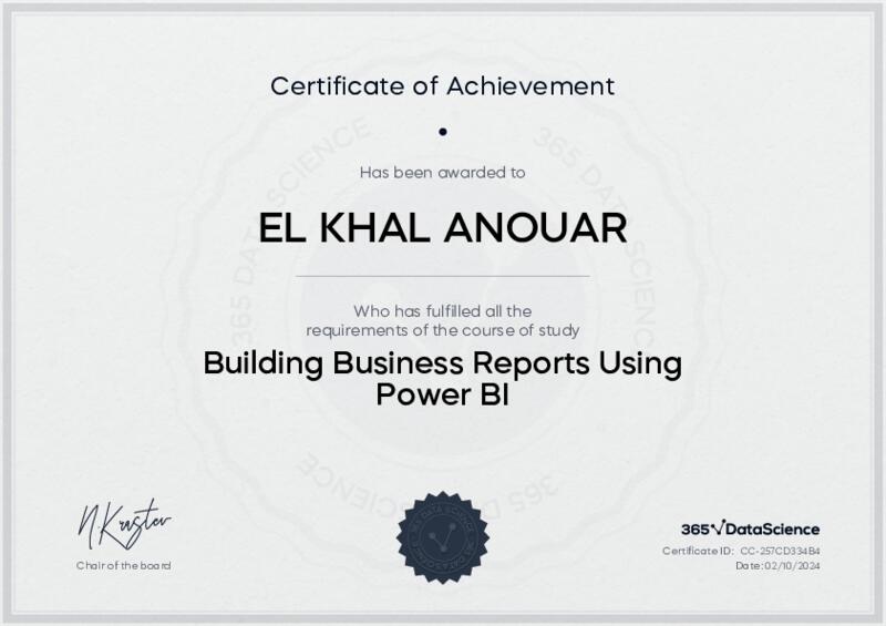 This user has been awarded the Building Business Reports Using Power BI Certificate for successfully completing the course exam. Holding this certificate demonstrates their proficiency on the topic and signifies they are qualified to apply their newly acquired expertise in the fields of data analytics and data science.