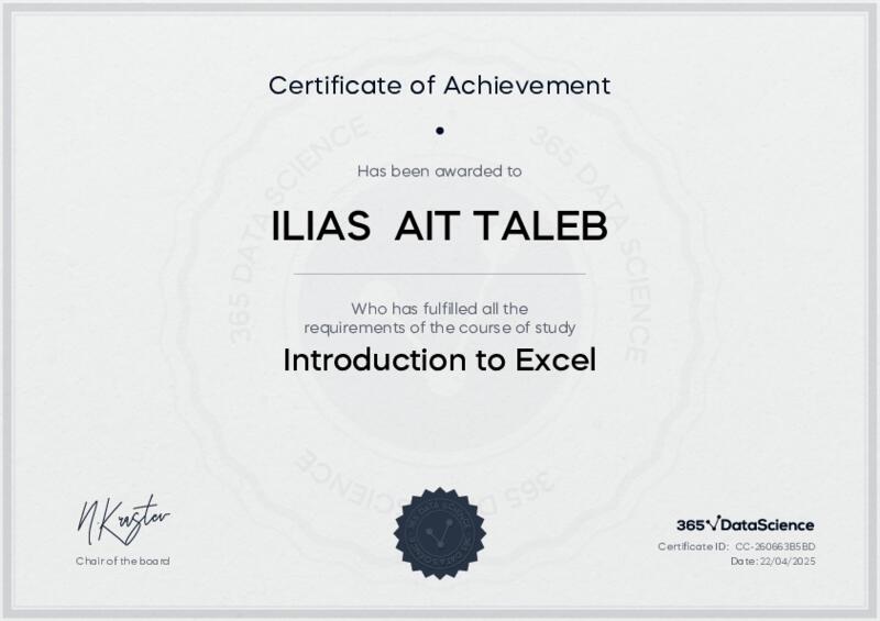 This user has been awarded the Introduction to Excel Certificate for successfully completing the course exam. Holding this certificate demonstrates their proficiency on the topic and signifies they are qualified to apply their newly acquired expertise in the fields of data analytics and data science.