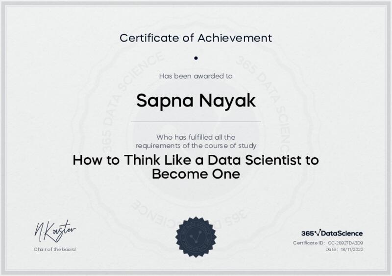 This user has been awarded the How to Think Like a Data Scientist to Become One Certificate for successfully completing the course exam. Holding this certificate demonstrates their proficiency on the topic and signifies they are qualified to apply their newly acquired expertise in the fields of data analytics and data science.