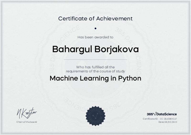 This user has been awarded the Machine Learning in Python Certificate for successfully completing the course exam. Holding this certificate demonstrates their proficiency on the topic and signifies they are qualified to apply their newly acquired expertise in the fields of data analytics and data science.