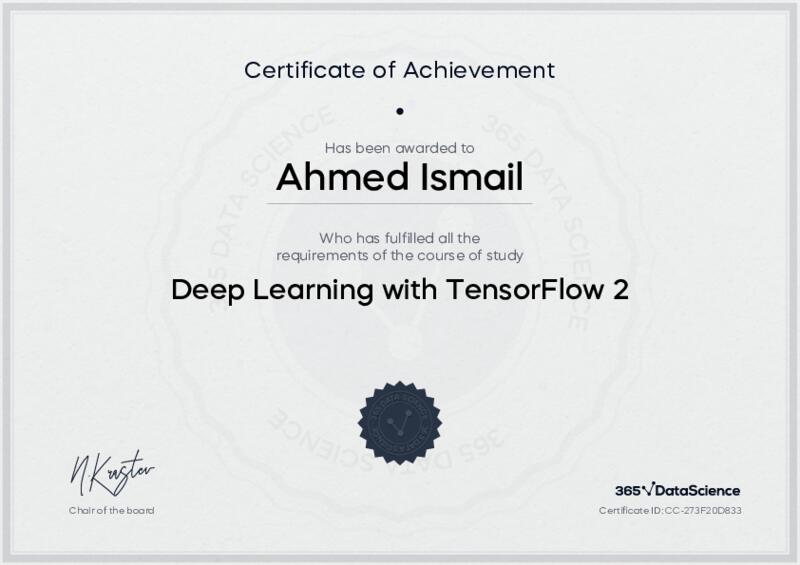 This user has been awarded the Deep Learning with TensorFlow 2 Certificate for successfully completing the course exam. Holding this certificate demonstrates their proficiency on the topic and signifies they are qualified to apply their newly acquired expertise in the fields of data analytics and data science.