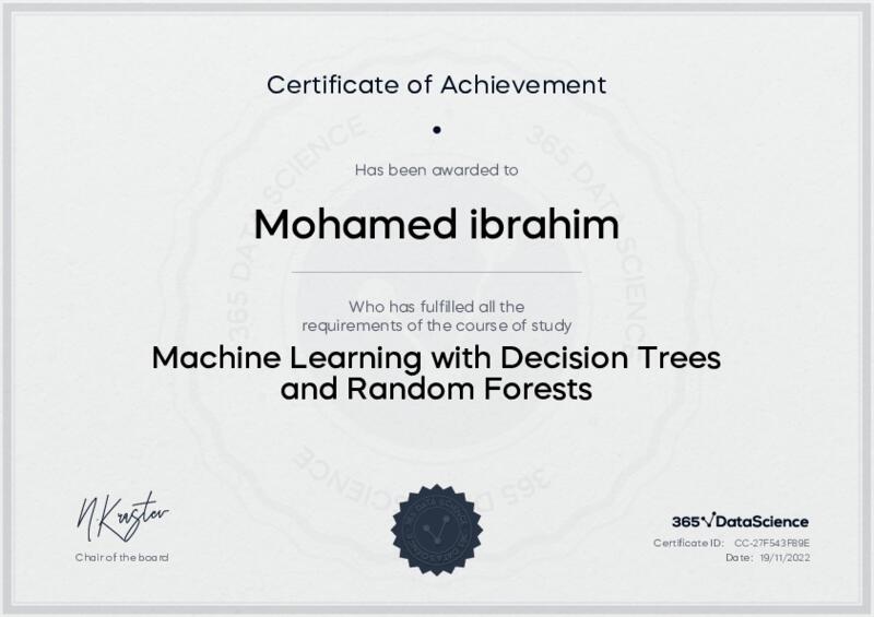 This user has been awarded the Machine Learning with Decision Trees and Random Forests Certificate for successfully completing the course exam. Holding this certificate demonstrates their proficiency on the topic and signifies they are qualified to apply their newly acquired expertise in the fields of data analytics and data science.