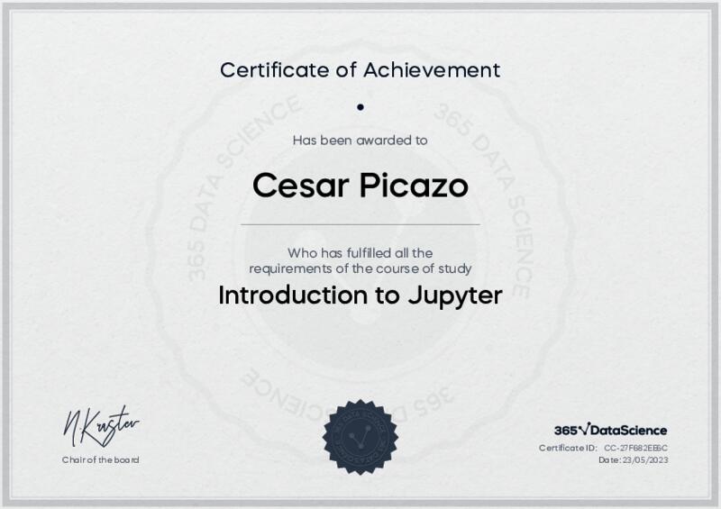 This user has been awarded the Introduction to Jupyter Certificate for successfully completing the course exam. Holding this certificate demonstrates their proficiency on the topic and signifies they are qualified to apply their newly acquired expertise in the fields of data analytics and data science.