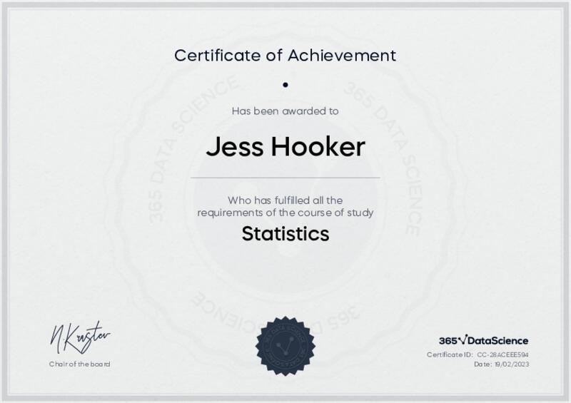 This user has been awarded the Statistics Certificate for successfully completing the course exam. Holding this certificate demonstrates their proficiency on the topic and signifies they are qualified to apply their newly acquired expertise in the fields of data analytics and data science.