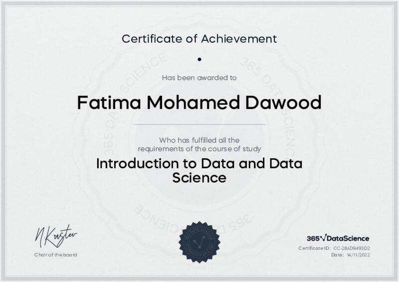 This user has been awarded the Introduction to Data and Data Science Certificate for successfully completing the course exam. Holding this certificate demonstrates their proficiency on the topic and signifies they are qualified to apply their newly acquired expertise in the fields of data analytics and data science.